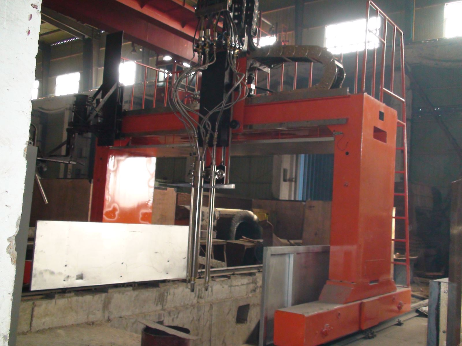 ● 龙门所配二台焊机、保护气气瓶(至少2个)、控制柜等均放在龙门两侧托架上,随龙门一起移动,进龙门的外部供电线缆采用滑线供给,使得龙门移动范围加大。