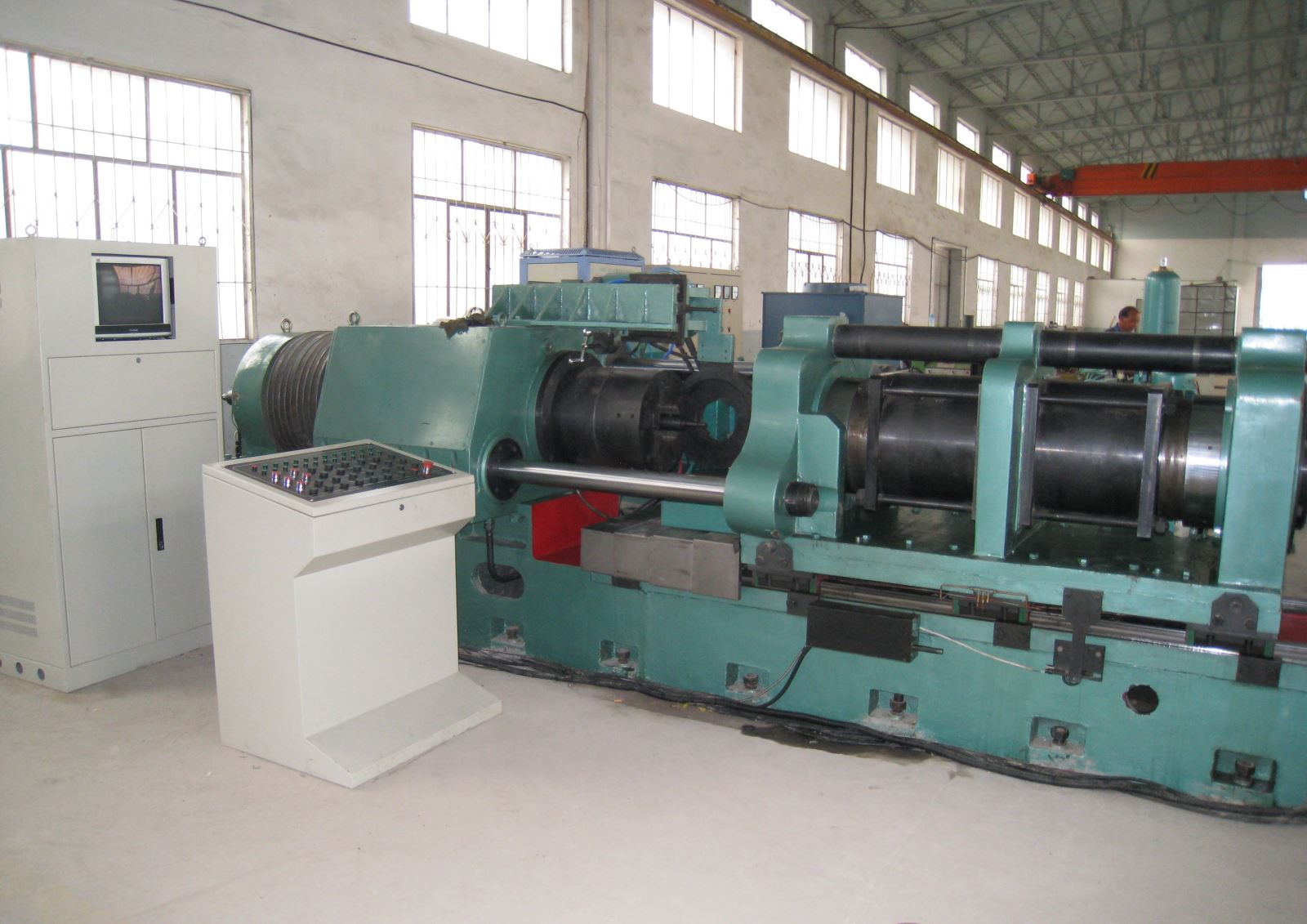 ● 主轴箱采用两个单列圆柱滚子轴承的结构方式,具有旋转精度高的优点,同时在主轴箱中设置两个推力调心滚子轴承, 一个采用固定安装方式,另一个采用平衡油缸活动安装的独特结构方式,来平均承载摩擦与顶锻的轴向力,使用寿命提高数倍。